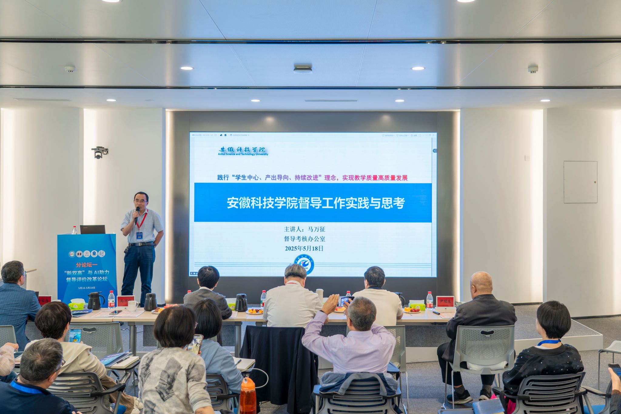 20256月27日上午,学校召开第九期督导论坛暨期末教学督导重点工作会议。凤阳校区、龙湖校区和滁州校区的参会形式为线上、线下同步进行。全体校院两级督导员、督导考核办公室工作人员参加了会议,会议由督导考核办公室马万征主持。马万征首先总结了本学期督导重点工作,充分肯定了全体督导对学校教育教学质量监控工作的辛勤付出,然后对校院两级教育教学督导联动工作进行了部署,提出了“严督善导-分类施策-全周期闭环”三位一体的校...