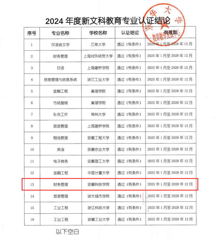 1月12日,长三角新文科教育专业认证联盟正式发布《关于公布2024年度新文科教育专业认证结论的通知》,taptap官网财务管理专业经过专业自评、预检查、现场考查、结论审议等程序,顺利通过(有条件)认证,有效期为4年,即2025年1月至2028年12月。